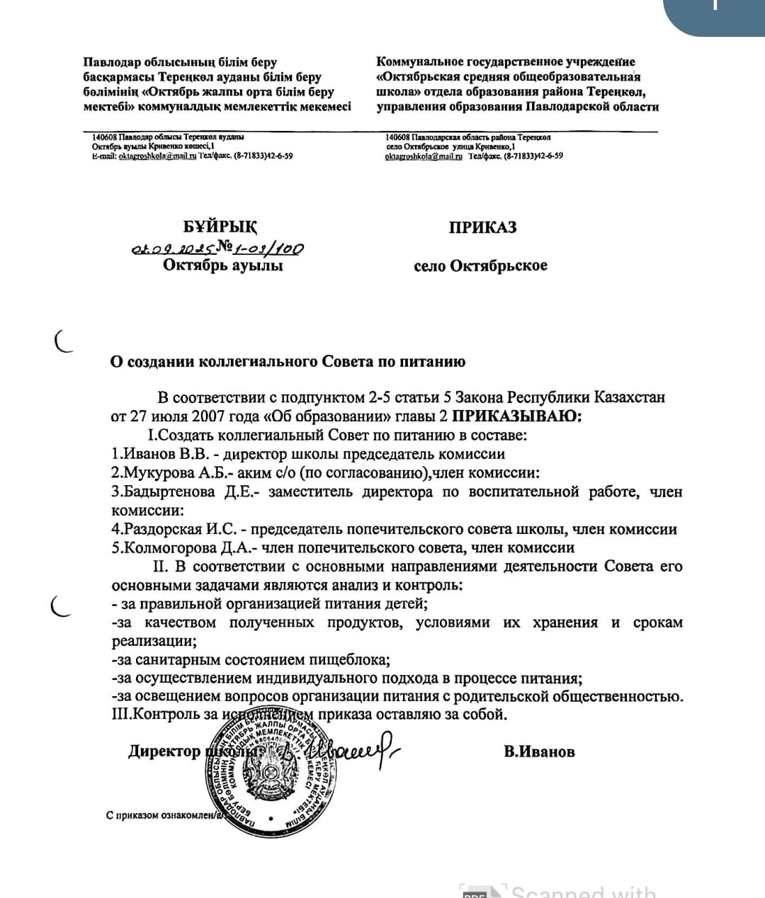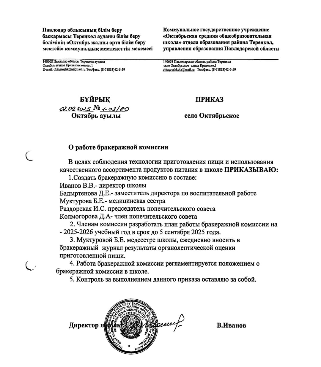 КГУ «Октябрьская средняя общеобразовательная школа» отдела образования района Тереңкөл, управления образования Павлодарской области |